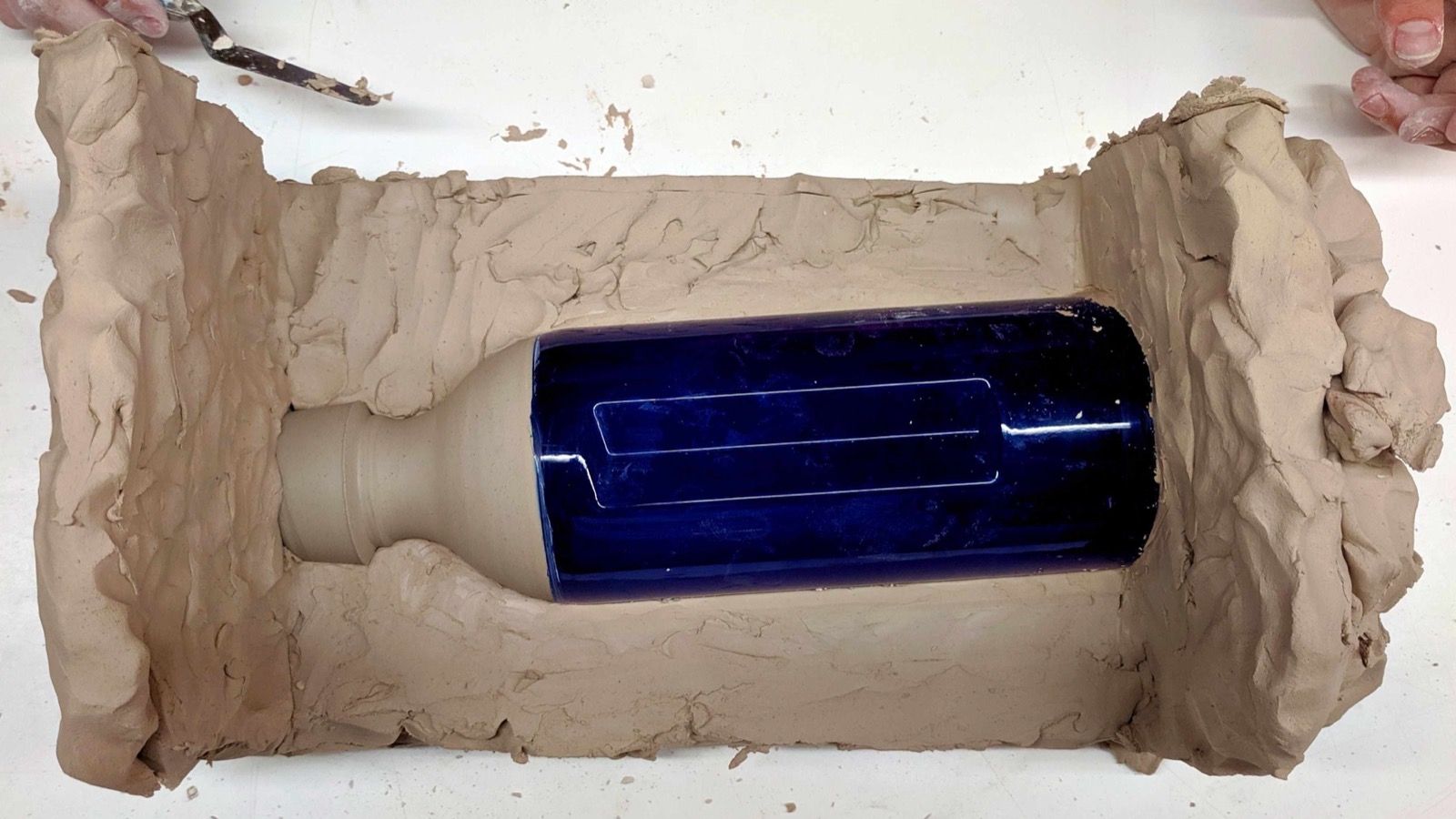 Creating a plaster mold from an altered glass bottle model for slip casting ceramics.